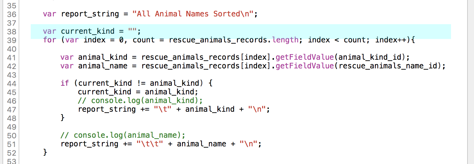 But first, we're going to update our current_kind variable to this record's Animal Kind so we wont reprint a header until there's a different value for animal_kind. This sets our our current_kind variable to "Cat".