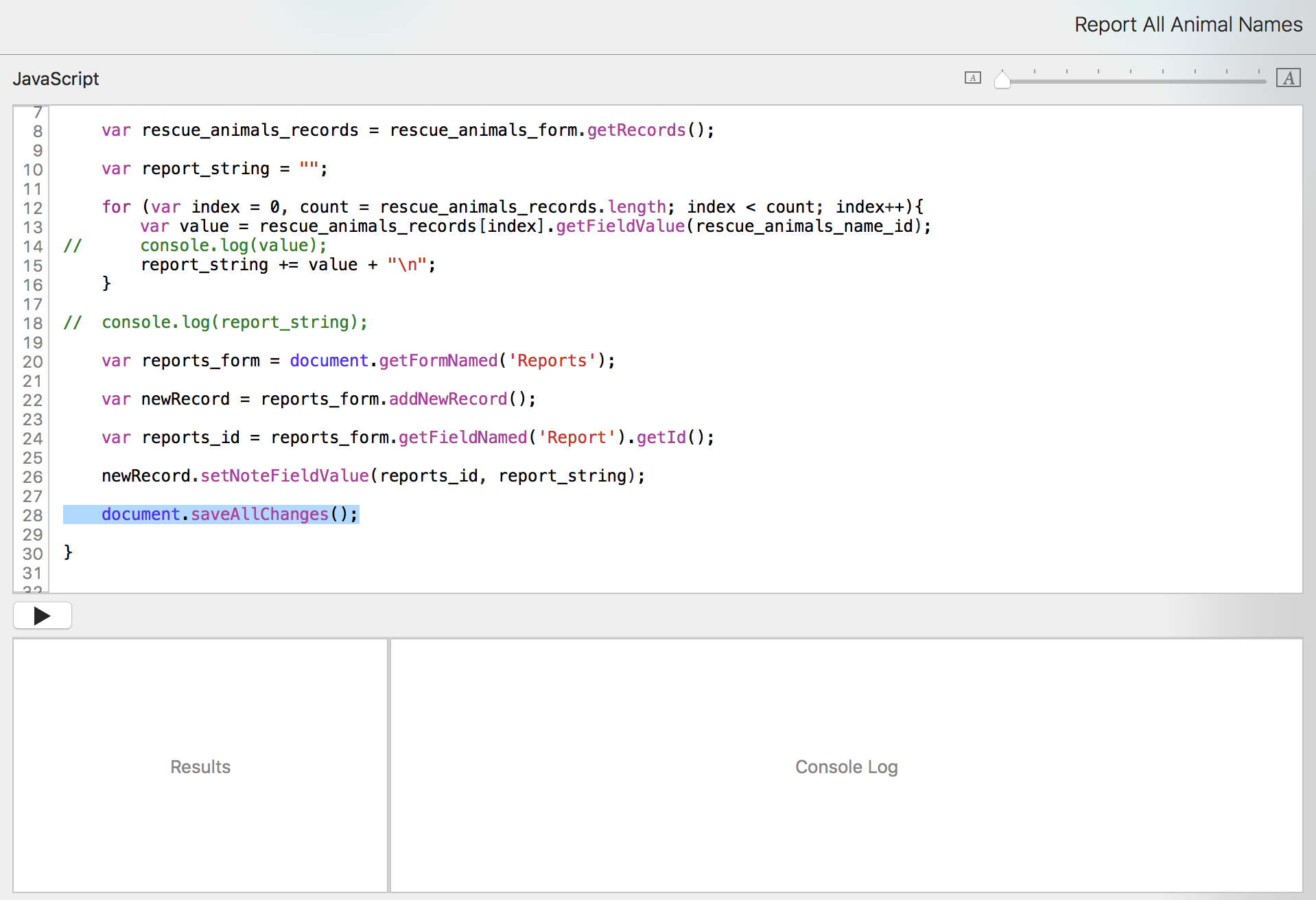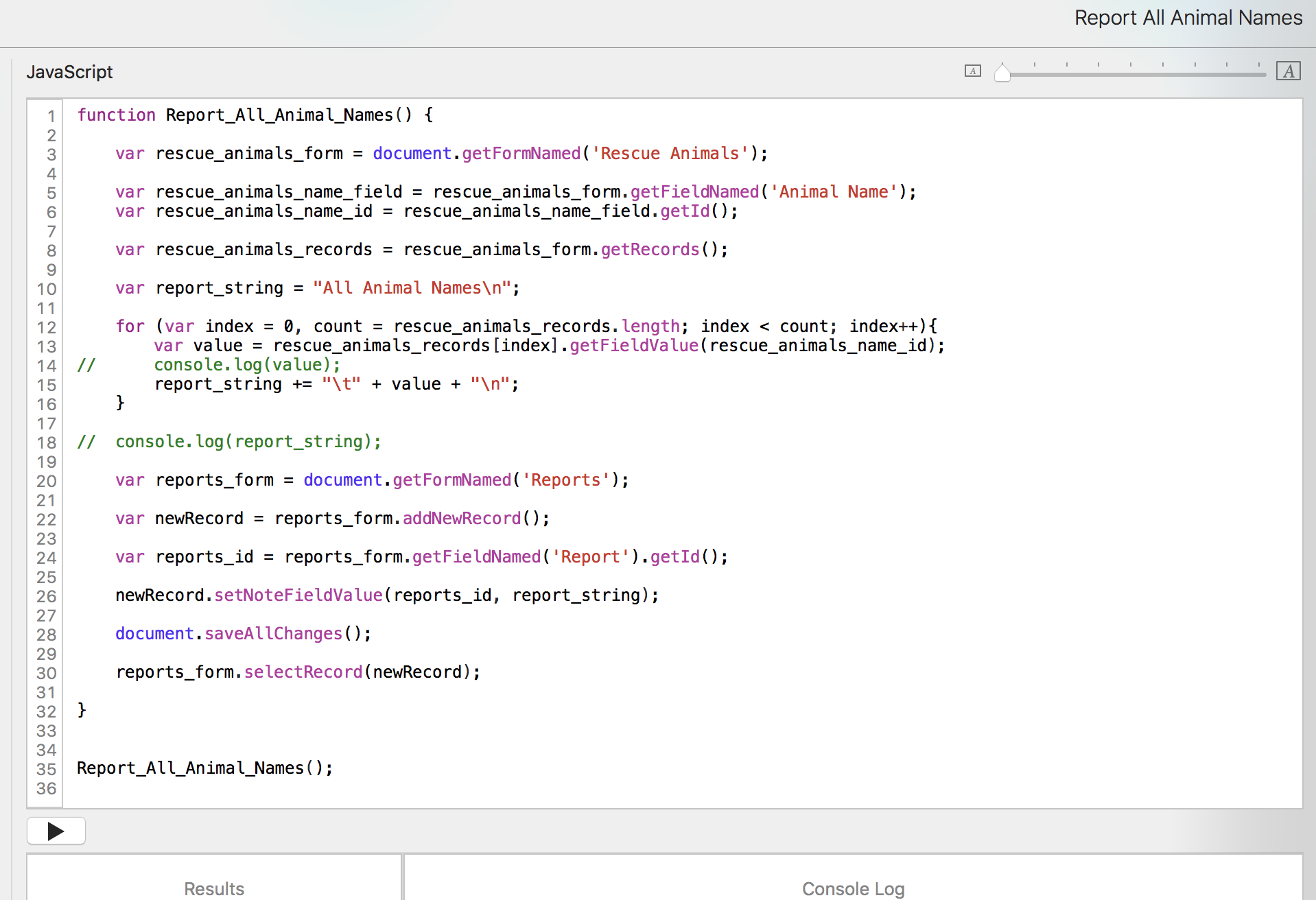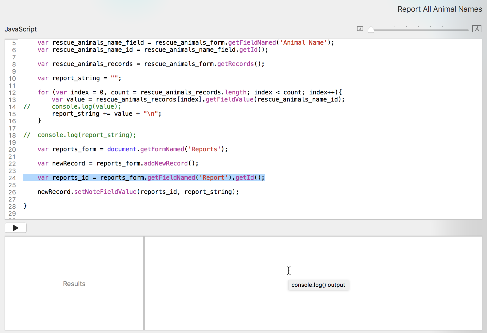 Now that we have that list of animal names, we want to put it into the Reports form. We don't want to have to open the console constantly to see the information. We just want to run the script from the pulldown menu and have it open to the report record.