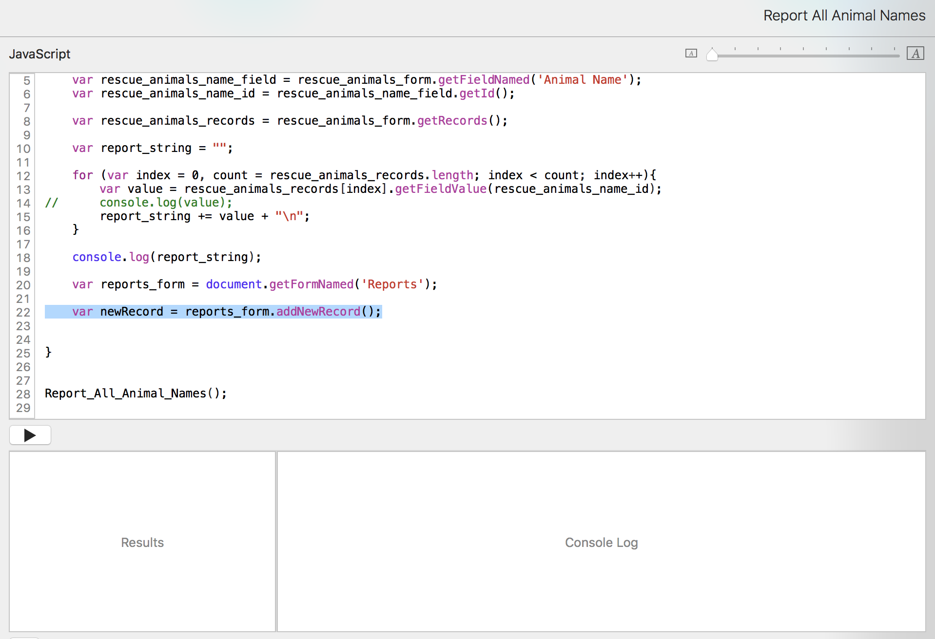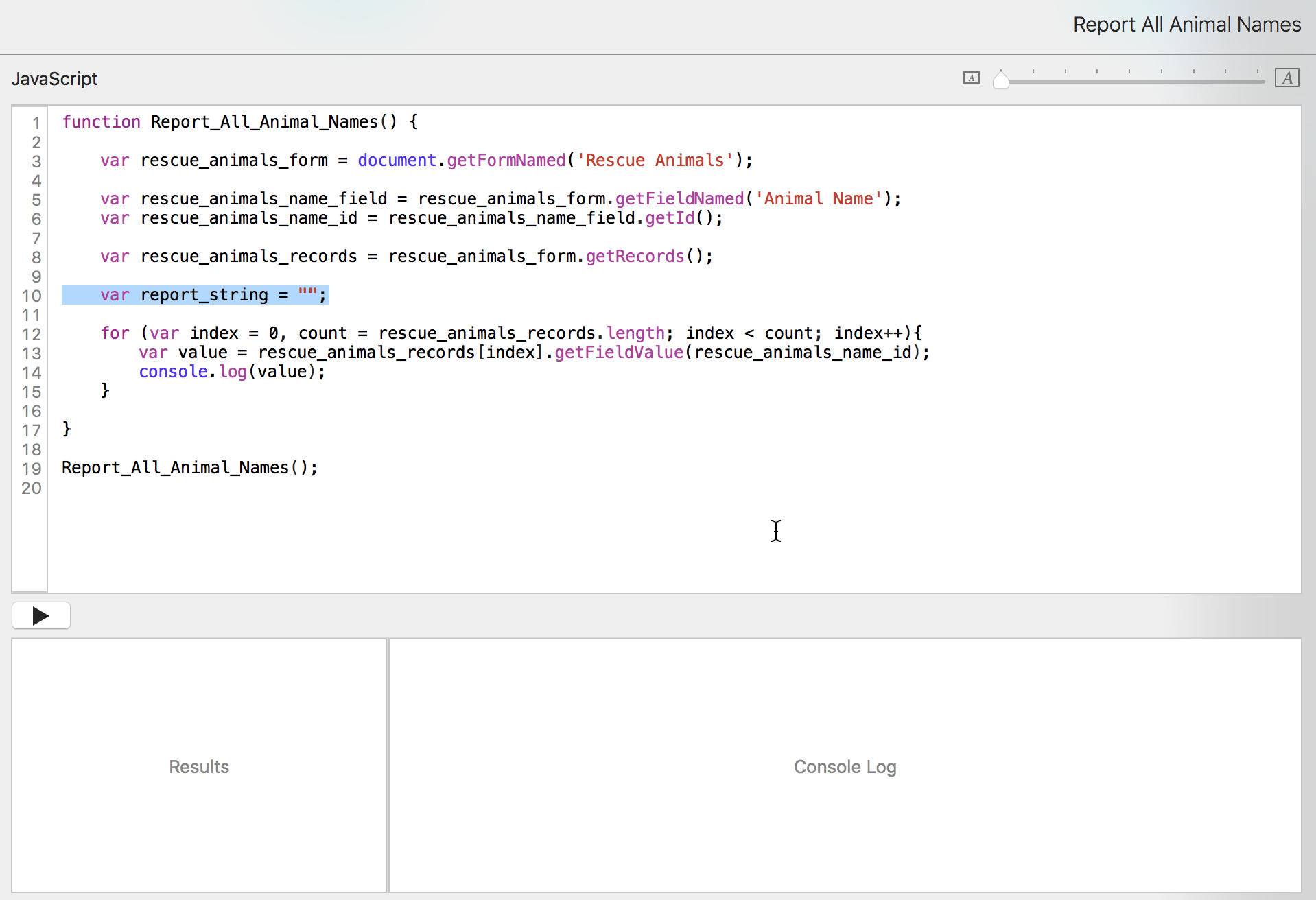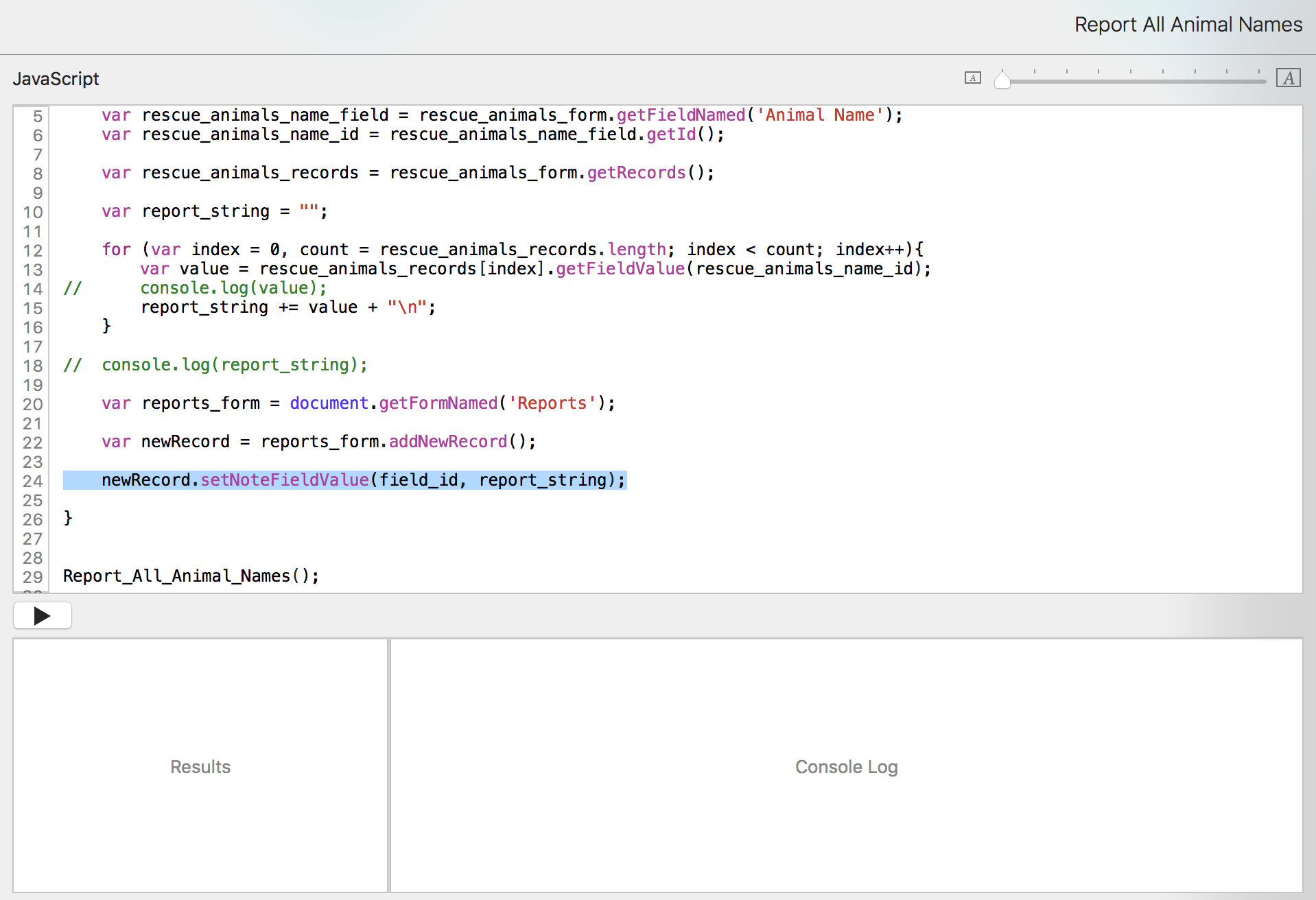 Now that we have that list of animal names, we want to put it into the Reports form. We don't want to have to open the console constantly to see the information. We just want to run the script from the pulldown menu and have it open to the report record.