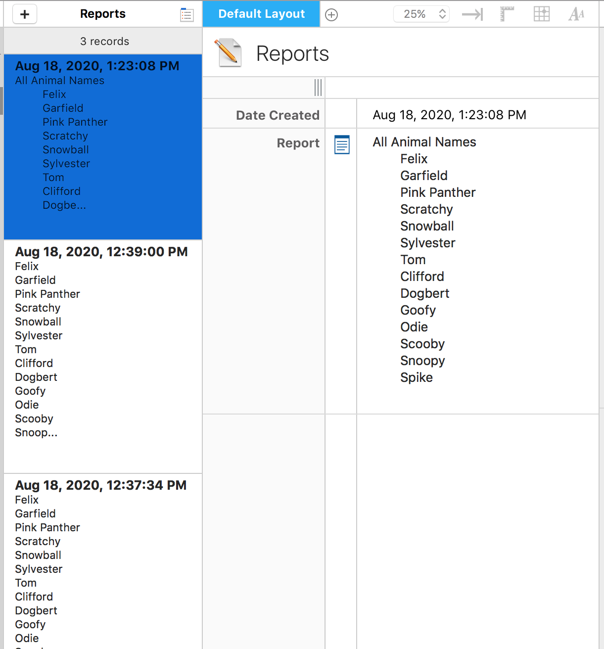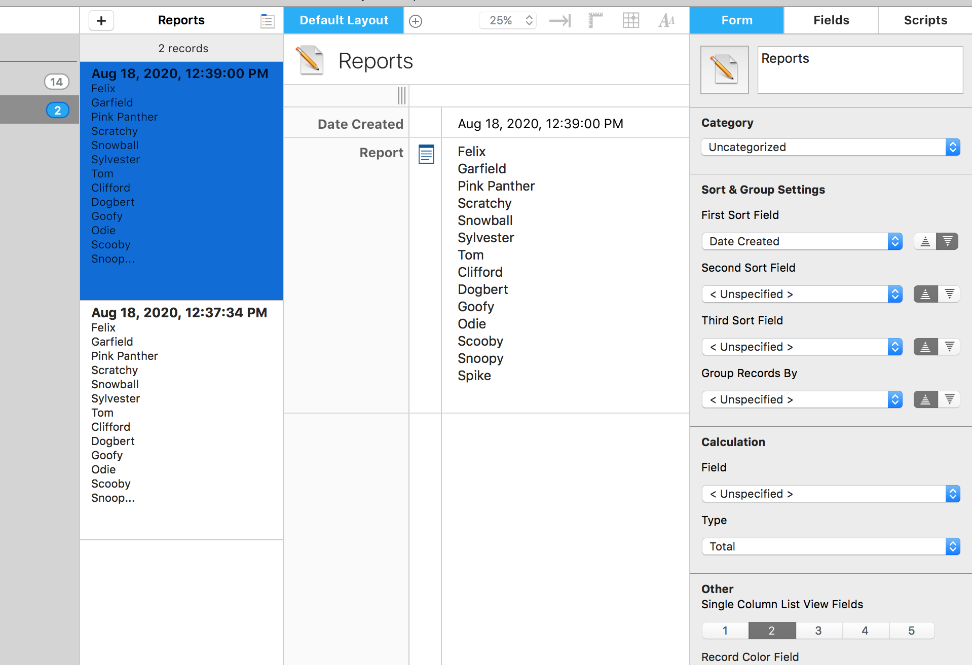 The new record is created, the names of the animals go into the Report field, the Reports form becomes active, and the new record becomes active. It's magic!